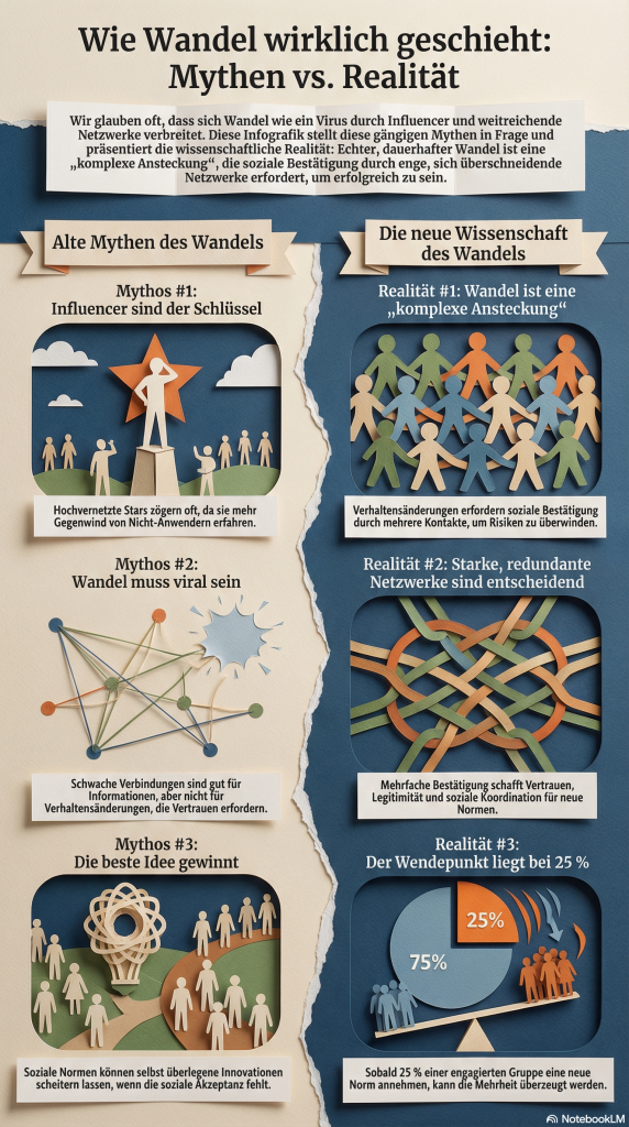 Vielleicht haben wir die letzten Jahre kollektiv missverstanden wie Wandel funktioniert. Wir glauben an das „virale Modell“. Wir denken, Ideen seien wie ein Grippevirus: Ein Kontakt genügt, und zack die Idee infiziert. Aber Verhalten ist kein Virus. Verhalten ist ein Teamsport. Es braucht mehr als einen Nieser, um Vertrauen aufzubauen.